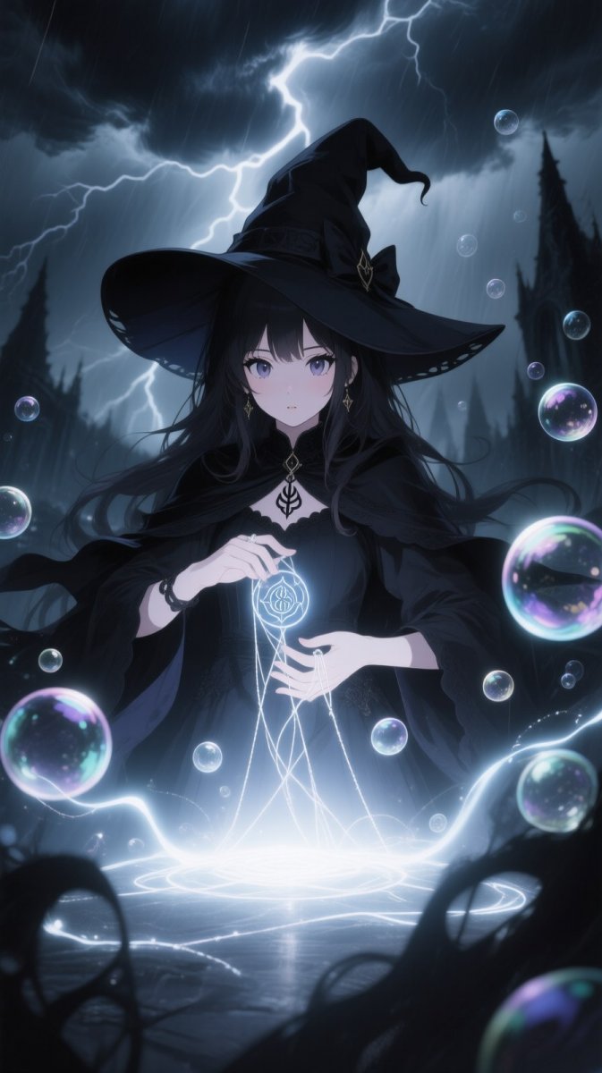 #5. 1girl, (Witch | Shade), Surrounded by Mystical Shadows and Bubbles of Light, With a (Curious | Enigmatic) Look as She Weaves Spells with Her Hands, A Brooding Storm in the Background, Representing Her Command Over the Dark and the Light, 🕯😳 #Role_CHimera