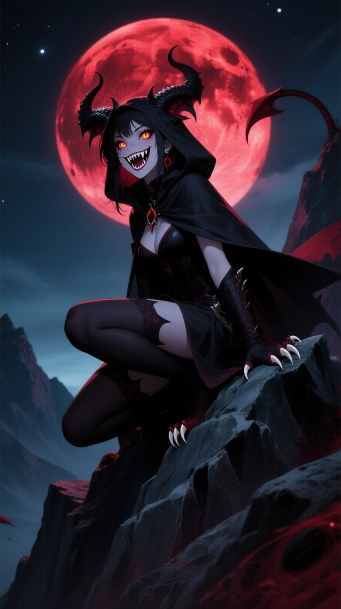 #3. 1girl, (Vampiric Beast | Mystic), Perched on a Craggy Mountain, Under a Blood Moon, With Sharp Fang Peeking Out from a (Wicked | Playful) Grin, Her Luminous Eyes Scanning the Night for Adventure, Cloaked in Enigmatic Shadows, Exuding Power and Charm, 🌕😈 #Role_CHimera
