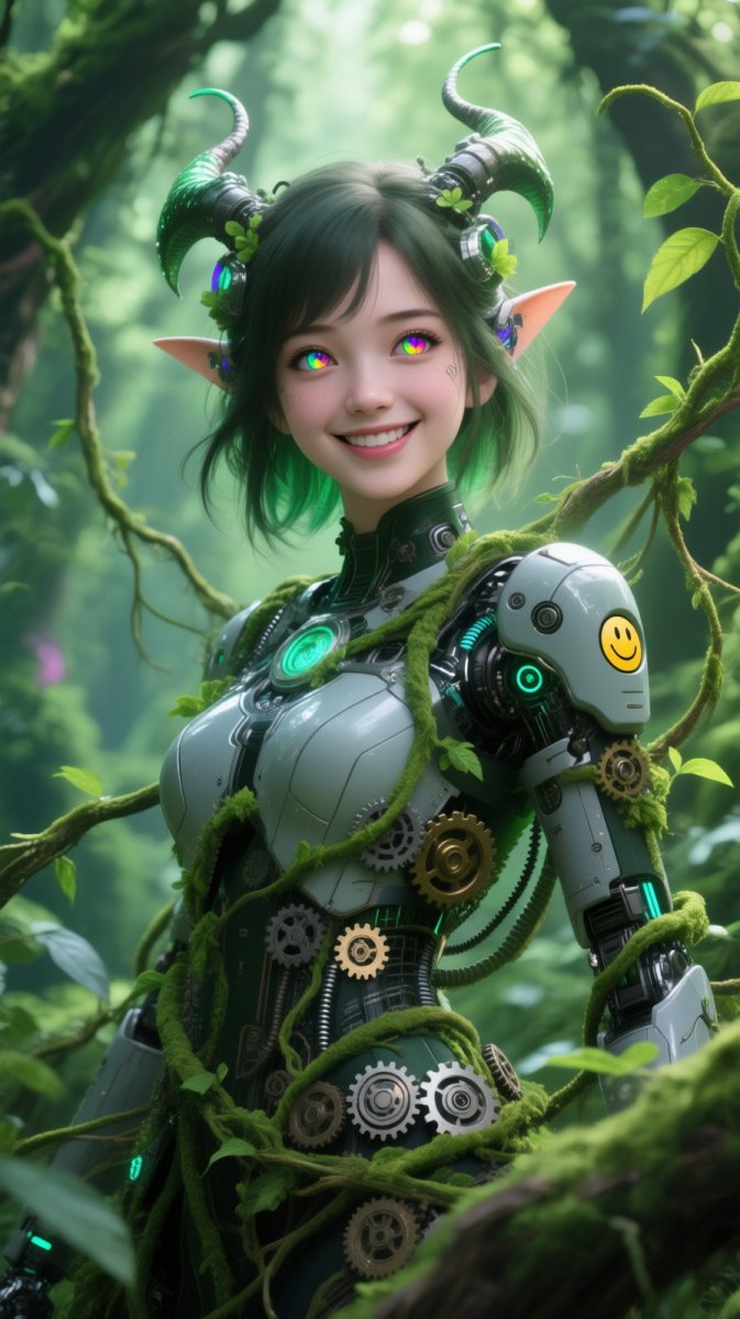 #4. 1girl, (Cyborg | Druid), Standing in a Lush Green Thicket with Gears and Vines Intertwined, A (Serene | Joyful) Smile Gracing Her Lips as Nature and Technology Harmonize Around Her, Embodying Wisdom and Innovation, Her Eyes Reflecting the Colors of the Forest, 🍃😁 #Role_CHimera