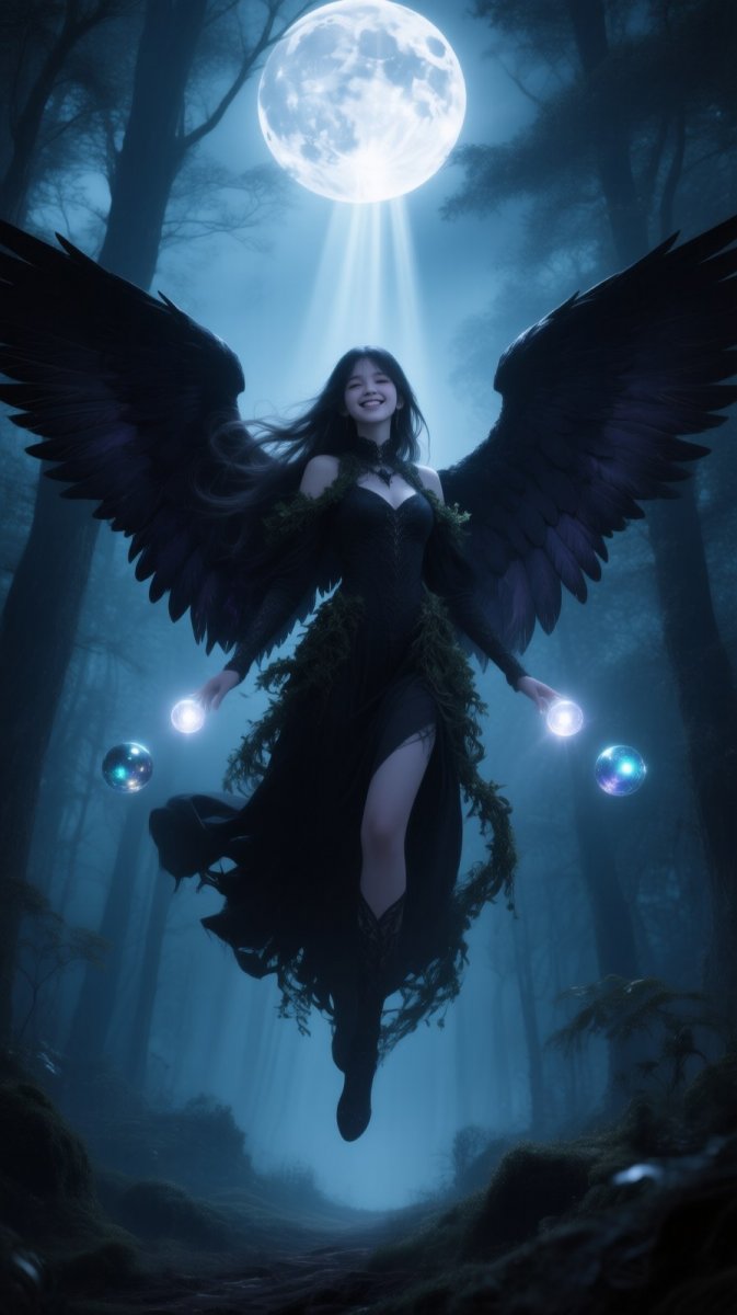 #1 1girl, (Fallen Angel | Enchantress), Wreathed in Shadows and Glimmering Orbs of Light, Hovering Above a Moonlit Forest, Her Dark Wings Spreading Wide and Casting Eerie Silhouettes, With a (Haunting | Mysterious) Smile that Speaks of Ancient Secrets, As Moonbeams Dance Off Her Silken Hair, Embracing Her Dual Nature of Despair and Magic, 😈 #Role_CHimera