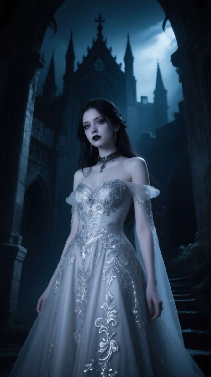 #3. 1girl, (Vampiress | Mystic), Bathed in an Otherworldly Light as She Lurks in the Shadows of a Gothic Castle, Wearing An Elegant Gown Embroidered with Silver Threads, An Enigmatic Expression on Her Face, Captivating and Haunting, with a (Seductive | Intriguing) Air Surrounding Her, 🏰😏 #Role_CHimera