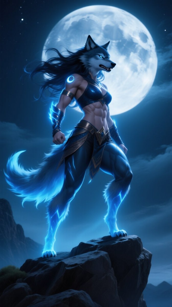 #2. 1girl, (Werewolf | Amazon), Fiercely Standing on a Rocky Outcrop Beneath a Moonlit Sky, Her Muscular Form Glimmering with a Mystical Blue Aura, Long Hair Wildly Flowing in the Wind, and a (Determined | Powerful) Look on Her Face, Ready to Conquer the Night with Grace and Ferocity, 🌕😠 #Role_CHimera