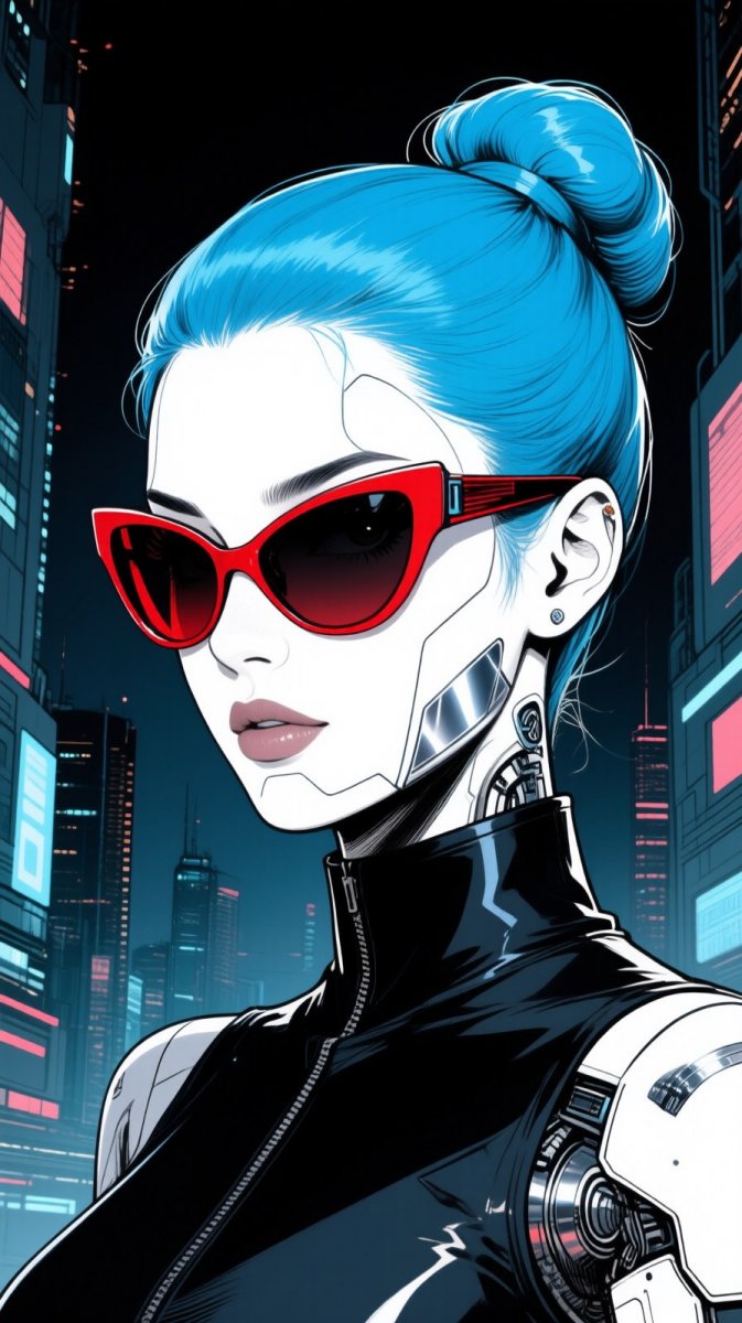 #2 ink drawing, illustration of a young woman with bright blue hair in a sleek updo, face painted in white with metallic designs contrasting against her dark outfit, large red and black visor-like sunglasses, background depicting a futuristic urban environment at night, overall atmosphere is mysterious and powerful #ROLE_CYBORG