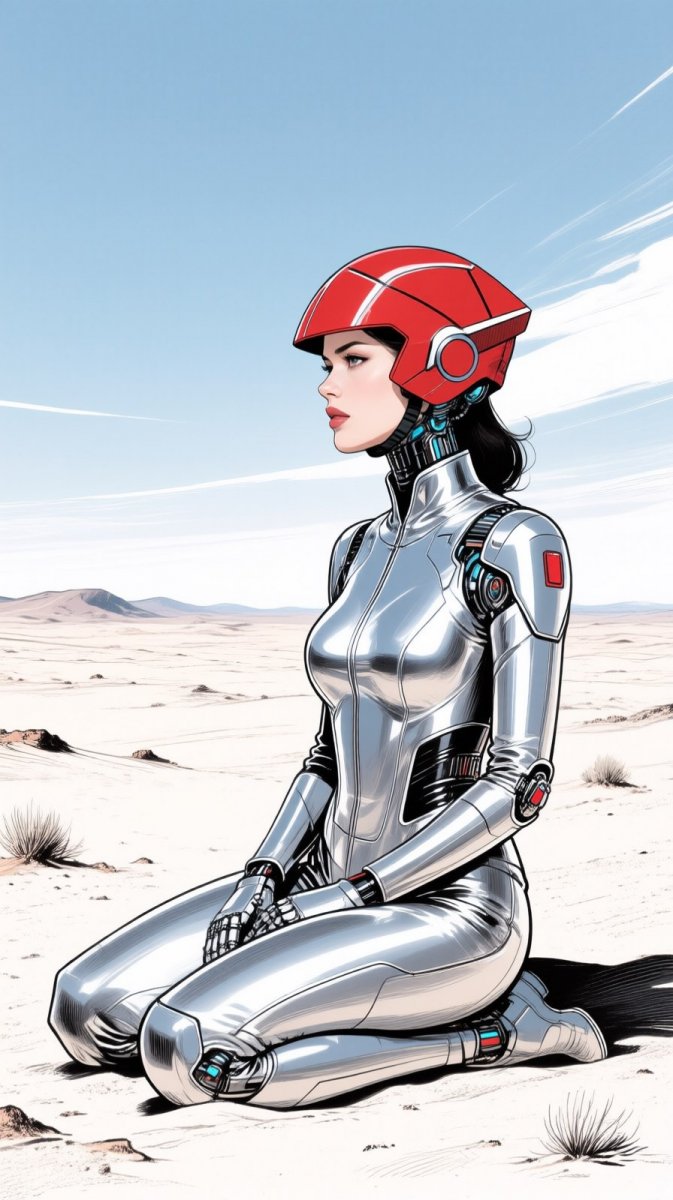 #4 ink drawing, illustration of woman sitting on the ground in a desert landscape, shiny silver futuristic suit, red helmet with angular lines, serious expression gazing into the distance, background features vast open sky and barren land, mood is solitary and futuristic #ROLE_CYBORG