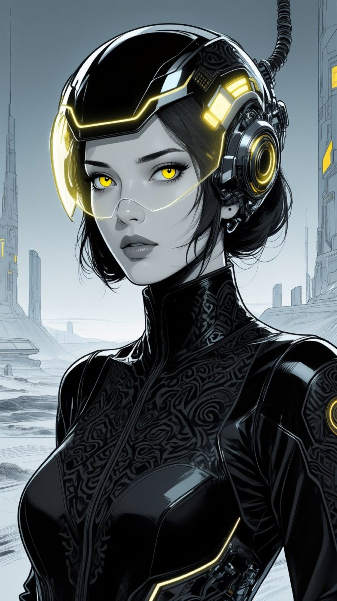 #5 ink drawing, illustration of digital art portrait focusing on a woman wearing a futuristic helmet with illuminated accents, stylish black outfit with intricate patterns, calm yet intense look, deep yellow eyes, setting in futuristic landscape with a melancholic ambiance #ROLE_CYBORG