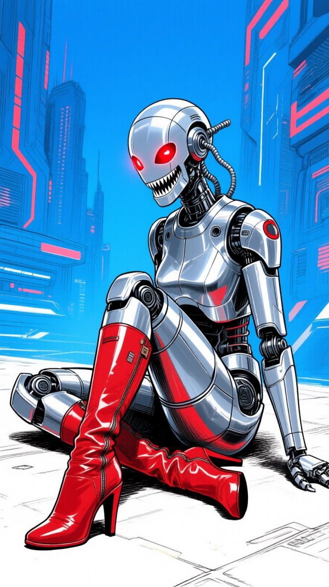 #2 ink drawing, illustration of robot figure sitting on ground with metallic silver and red armor, round head and glowing red eyes, sharp teeth visible, wearing high-heeled boots, serious expressions, vibrant blue background with futuristic city elements, overall mood intense and alien #ROLE_CYBORG