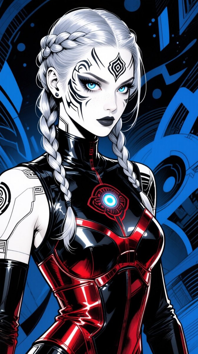 #2 ink drawing, illustration of a woman with silver hair styled in braids, wearing a black and red metallic outfit, face painted with intricate designs, large glowing eyes, background filled with abstract shapes and dark blue tones, conveying a sense of power and intensity #ROLE_CYBORG