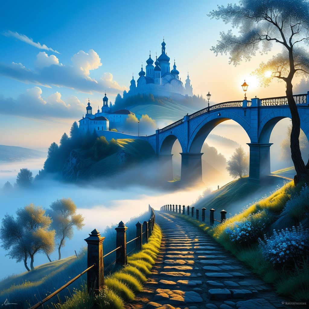 Завораживающая серебристо-голубая монохромная панорама, сотканная из тончайших деталей и пронизанная атмосферой утренней дымки. В центре композиции возвышается величественный холм, а над ним изящно перекинут мост в стиле барокко, словно сошедший со страниц истории. Мягкий рассветный свет ласкает пейзаж, подчеркивая нежность трав и создавая игру теней на фоне живописного неба. Вдали виднеются силуэты деревьев, окутанные легкой дымкой, добавляющей картине загадочности и глубины. Картина излучает спокойствие и гармонию, приглашая зрителя погрузиться в мир безмятежной красоты и насладиться каждым штрихом безупречного рисунка. Это произведение искусства – настоящий гимн природе и мастерству исполнения, где каждый элемент тщательно проработан, создавая неповторимую атмосферу умиротворения и вдохновения. Художественный стиль сочетает в себе реализм и мечтательность, позволяя зрителю увидеть мир глазами творца и ощутить его восхищение перед красотой окружающего пространства. Утонченность цветовой палитры и филигранная проработка деталей делают эту картину настоящим шедевром, достойным самого пристального внимания и восхищения. Это визуальный этюд о пробуждении природы, наполненный светом и надеждой на новое начало