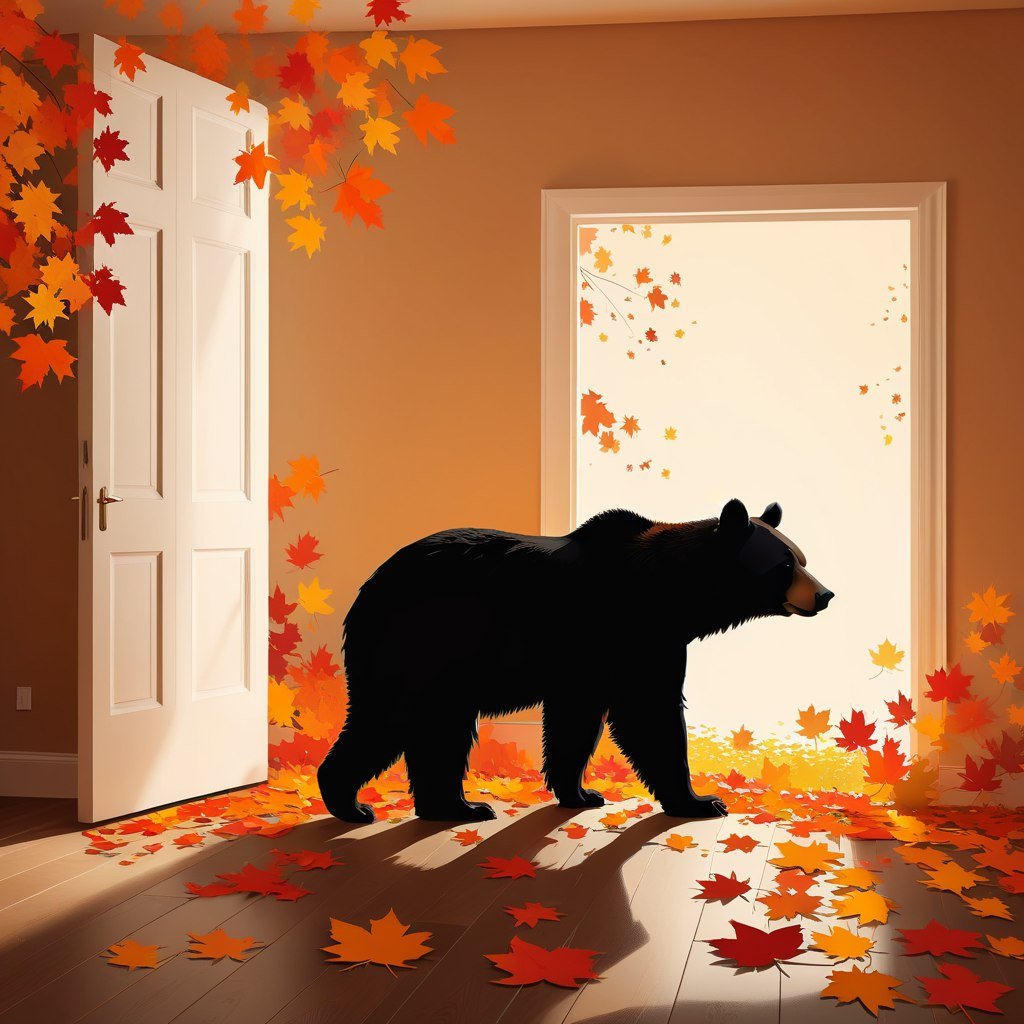 Minimalist 2D digital illustration: black bear silhouette with white rim light, standing on hind legs in profile on the right beige walls at home, looking left with surprised wide eyes. Ground and top filled with vibrant autumn maple leaves (orange, red, yellow), some falling. Solid black background. High contrast, cartoonish style, night atmosphere.