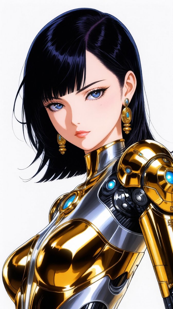 #1 <lora:1914845:1>, anime, illustration, close-up of a futuristic female cyborg wearing metallic gold and silver accessories, posing with confidence, minimalist background, inspired by hajime sorayama and 80s aesthetic, highly detailed, photorealistic finish #Role_Sorayama