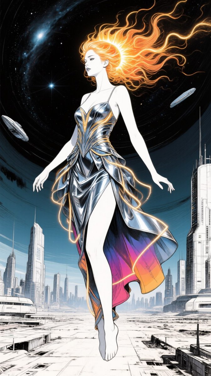 #5. illustration, ink drawing, a science fiction muse crafted from metallic fabrics and illuminated strands, her hair resembling solar flares, wearing an avant-garde dress that shifts colors with her emotions, floating through a deserted future city, with the skyline blending into a cosmic void, presenting a commentary on humanity's connection to technology and emotion.#Role_Unsurreal