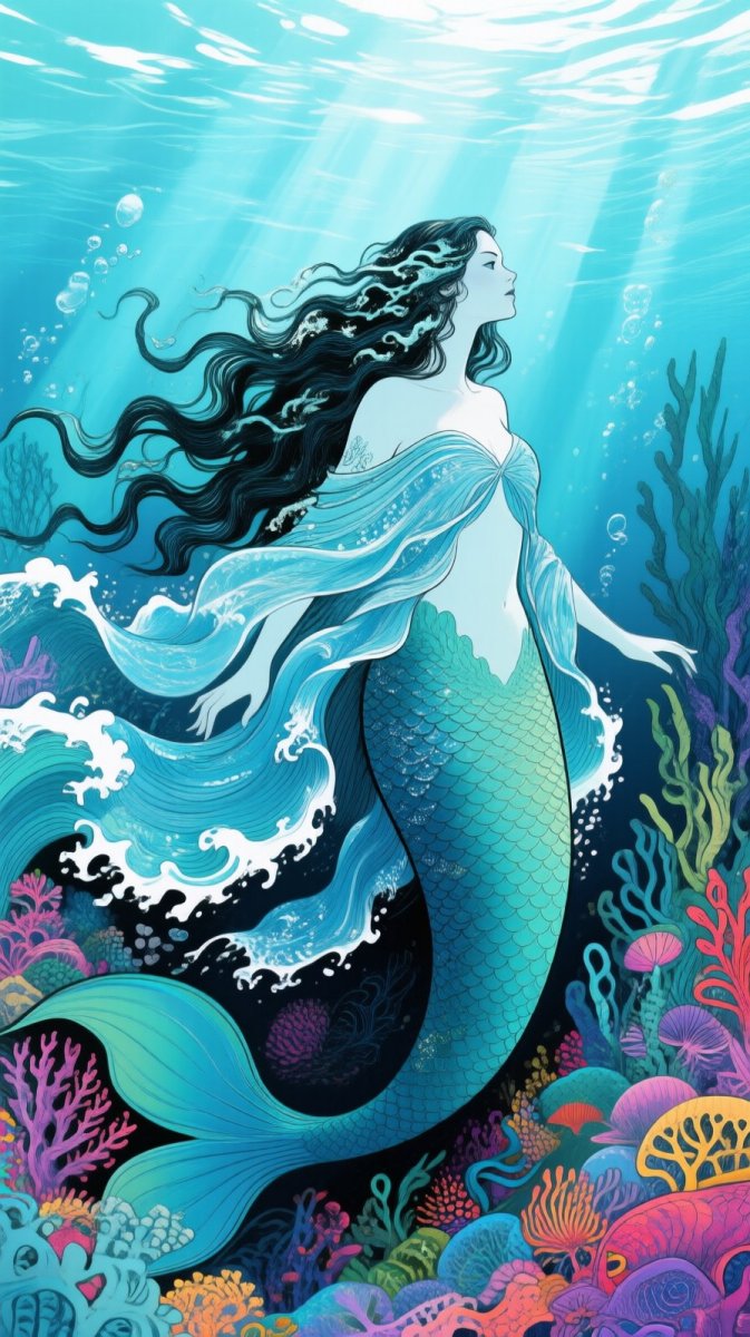 Сирена из глубин: волшебный мир под водой в чернилах и красках - Пример изображения, созданного ИИ Qwen Image