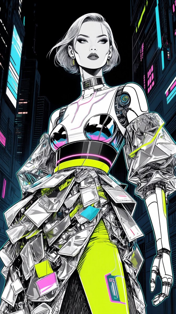 #4. a futuristic cyborg model dressed in an avant-garde outfit made of recycled materials, reflective surfaces and neon accents create a striking contrast against a dark urban backdrop, her fierce expression embodies empowerment and innovation, illustration, ink drawing #Role_Unsurreal