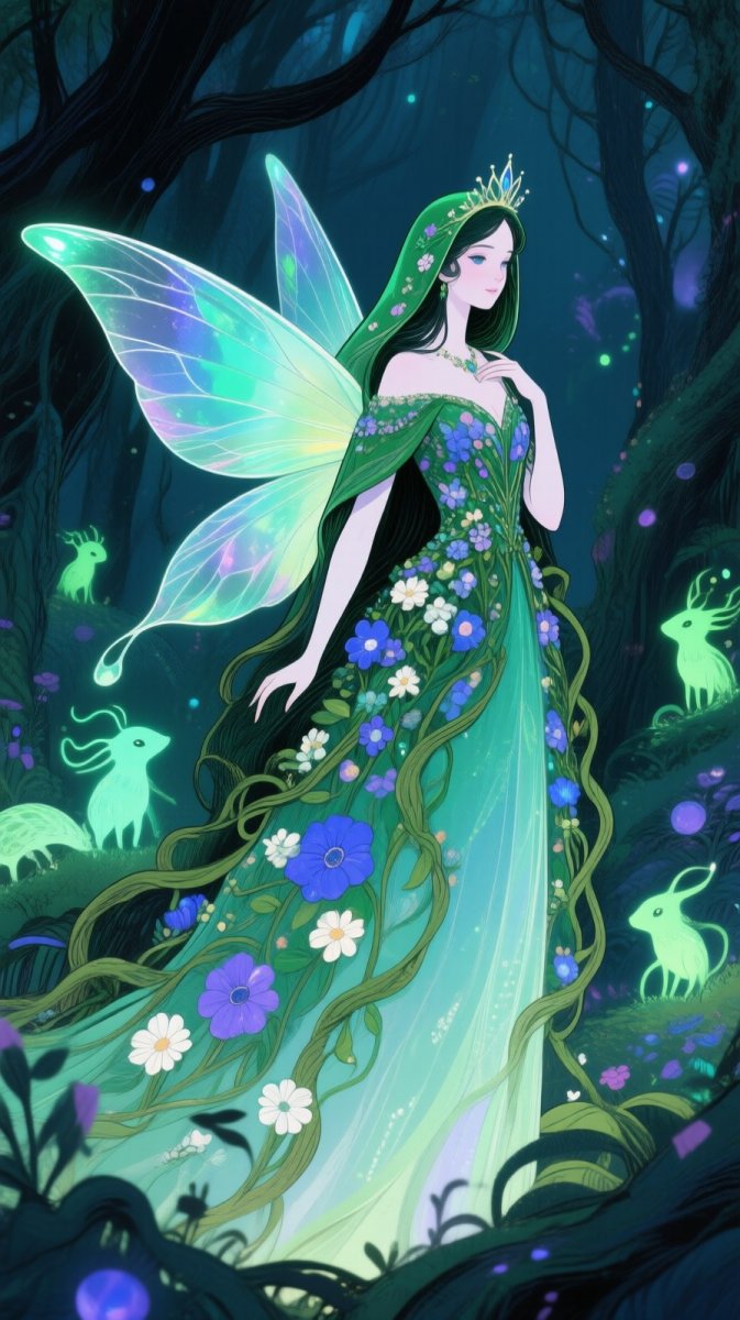 #3. a whimsical fairy queen cloaked in a gown of flowers and vines, her translucent wings shimmering with shades of emerald and sapphire, surrounded by a magical forest filled with luminescent creatures, her elegant pose creating au dreamlike atmosphere, illustration, ink drawing #Role_Unsurreal
