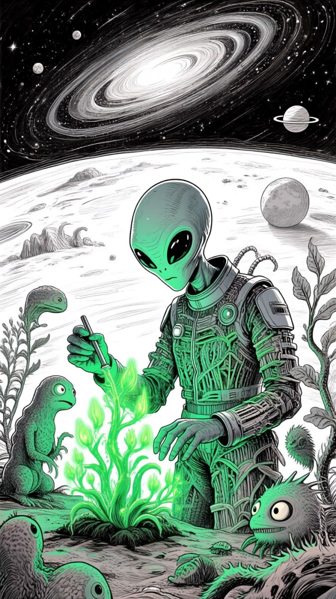 #5. an alien botanist studying strange, bioluminescent plants on a distant planet, wearing a suit made of environmental materials, surrounded by curious creatures and a swirling galaxy above, illustration, ink drawing #Role_Unsurreal