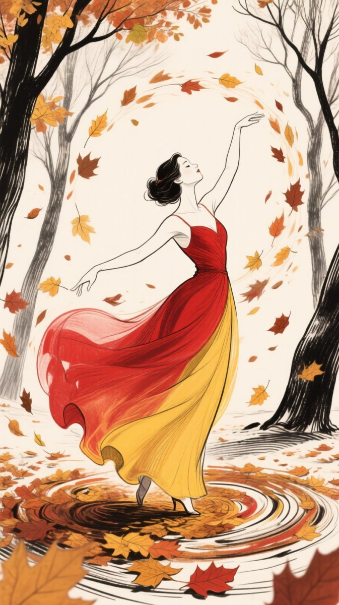 #3. an elegant figure of a woman gracefully dancing in a swirl of autumn leaves, her gown blending shades of red and yellow, with a backdrop of trees shedding their foliage, capturing the essence of change and transition, illustration, ink drawing #Role_Unsurreal