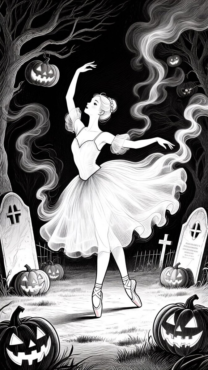 #5. an intricate illustration of a ghostly ballerina dancing in a graveyard, her ethereal dress flowing around her like smoke, illuminated by flickering jack-o'-lanterns, blending whimsy with a touch of spookiness, ink drawing #Role_Unsurreal