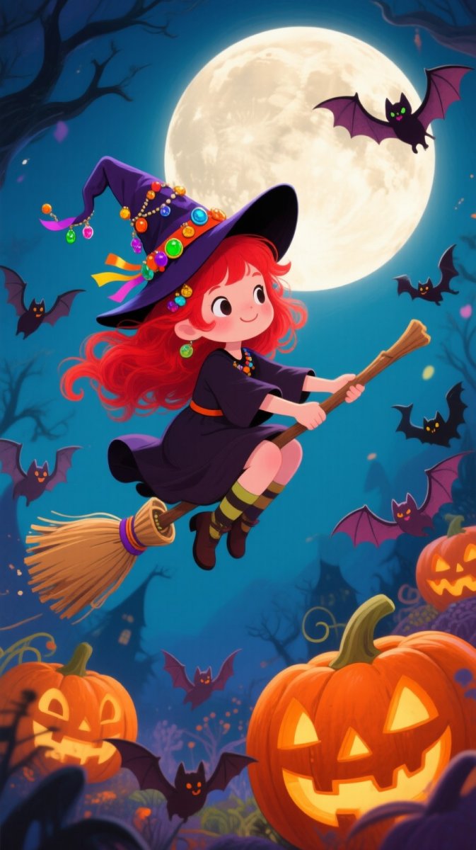 #1. a whimsical illustration of a cute red-haired witch flying on a broomstick under a full moon, surrounded by playful bats and glowing jack-o'-lanterns, her pointed hat adorned with colorful charms and ribbons, creating a magical and enchanting atmosphere, ink drawing #Role_Unsurreal