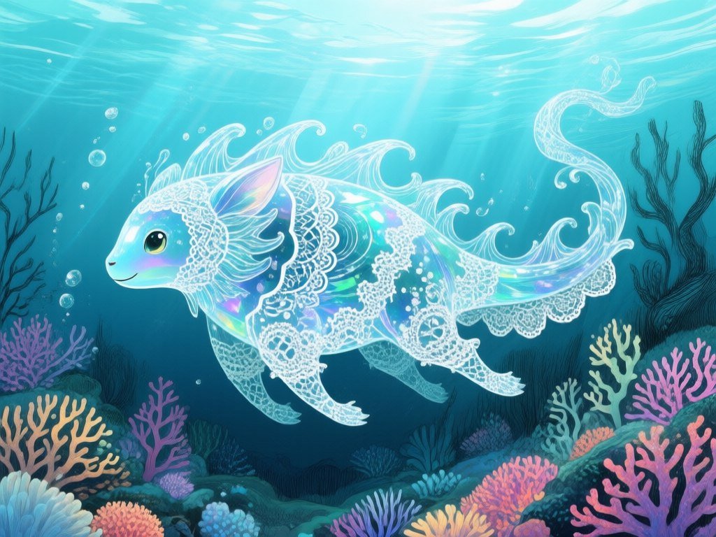 #1. a whimsical creature made of shimmering glass and delicate lace, adorned with intricate patterns inspired by ocean waves, floating gracefully in a surreal underwater landscape filled with vibrant corals and ethereal light, illustration, ink drawing #Role_Unsurreal