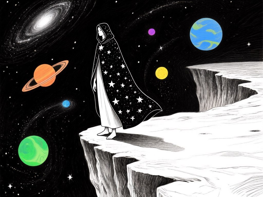 #5. an enigmatic figure in a cloak of stars and galaxies, standing at the edge of a cosmic abyss, with swirling colors and celestial bodies surrounding them, embodying the mysteries of the universe and the beauty of the unknown, illustration, ink drawing #Role_Unsurreal