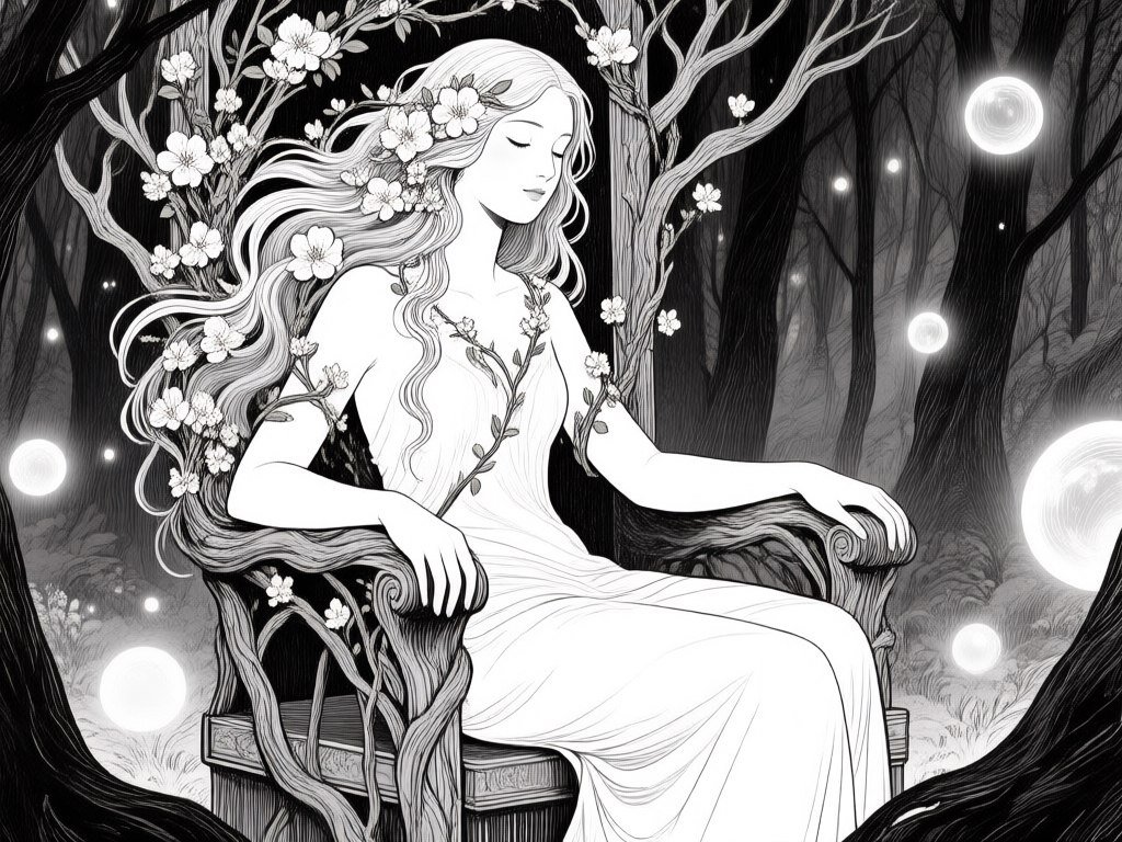 Божественная красота в объятиях природы. Нежная богиня, чьи волосы – это каскад распускающихся цветов и гибких лоз, восседает на троне из переплетенных ветвей. Вокруг неё простирается таинственный лес, окутанный мягким светом и мерцающим сиянием магических сфер. Эта завораживающая иллюстрация, выполненная в технике тушевой живописи, передаёт атмосферу безмятежности и волшебства. В каждом штрихе чувствуется стремление к гармонии с окружающим миром, а образ богини символизирует плодородие, жизненную силу и связь с природой. Мягкое освещение и деликатная детализация создают ощущение сказочной реальности, где красота и спокойствие царят повсюду. Кажется, что время здесь замерло, позволяя зрителю полностью погрузиться в эту атмосферу умиротворения и очарования. Это не просто изображение – это портал в мир грёз, где реальность переплетается с фантазией, а божественное великолепие гармонично сочетается с природной красотой. Идеальное воплощение сюрреалистической мечты, вдохновляющее на размышления о вечной связи между человеком и природой, духовным поиском и красоте окружающего мира