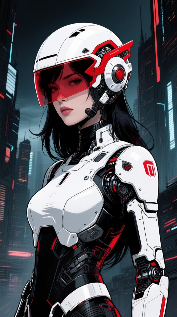 #4 ink drawing, illustration of a woman with dark hair and a white helmet adorned with red accents, face partially covered in metallic armor, serious expression, background is a futuristic cityscape with dramatic lighting, mood is dark and mysterious #ROLE_CYBORG