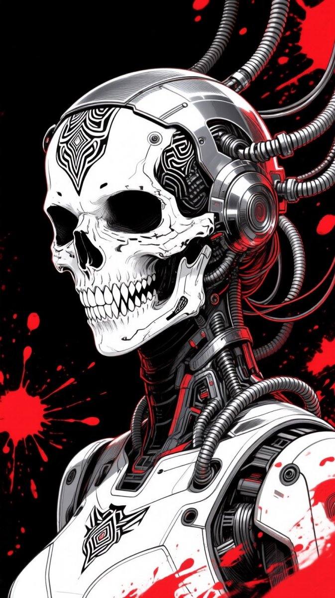 Мрачный образ кибернетической футуристической воительницы воплощен в завораживающей чернильной иллюстрации. Ее лицо, напоминающее череп, обрамлено сложными узорами и подчеркнуто острыми зубами, создавая ощущение зловещей красоты и нечеловеческой силы. Металлический шлем, оплетенный переплетением проводов, добавляет изображению технологичный оттенок, намекая на ее кибернетическую природу и скрытую мощь. Темный фон, пронизанный вспышками алого и черного цветов, усиливает гнетущую атмосферу и подчеркивает драматизм композиции. Вся работа излучает ощущение предчувствия и внушительной мощи, заставляя зрителя задуматься о природе будущего, где границы между человеком и машиной размыты. Эта иллюстрация - мощное заявление об эволюции человечества, исследующее темы идентичности, власти и неизбежности технологического прогресса. Она является визуальным манифестом силы, решимости и таинственности, воплощенных в образе кибернетической воительницы, готовой к битве за будущее. Изображение пронизано ощущением опасности и загадочности, приглашая зрителя погрузиться в его мрачный и захватывающий мир