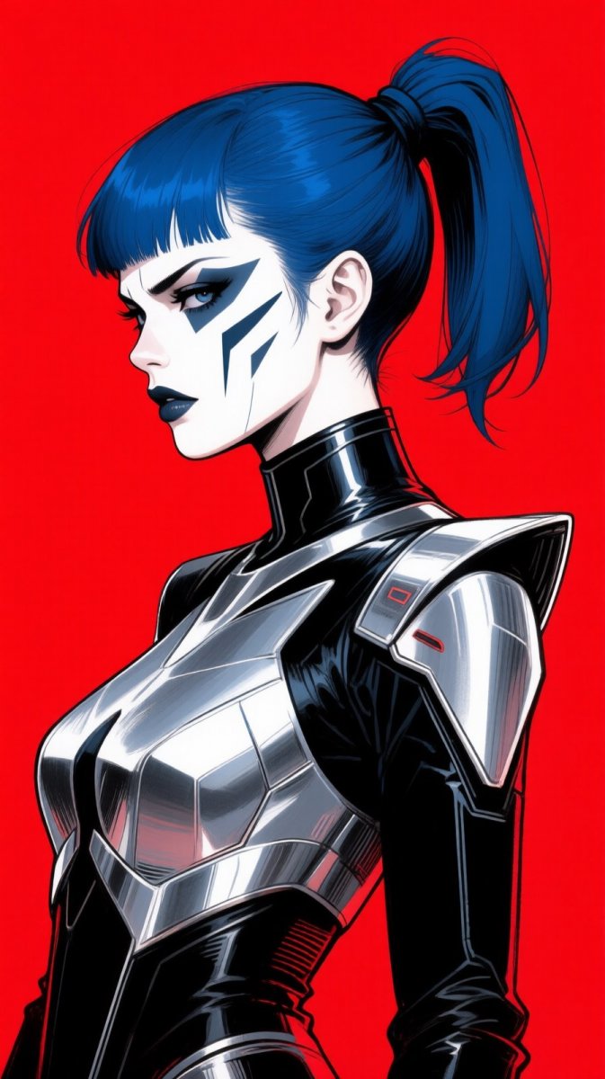 #2 ink drawing, illustration of a woman with short blue hair in a high ponytail, wearing a futuristic outfit with sharp edges and metallic accents, face painted with geometric designs in white and silver, deep red background enhancing her fierce expression, mood is dark and powerful #ROLE_CYBORG
