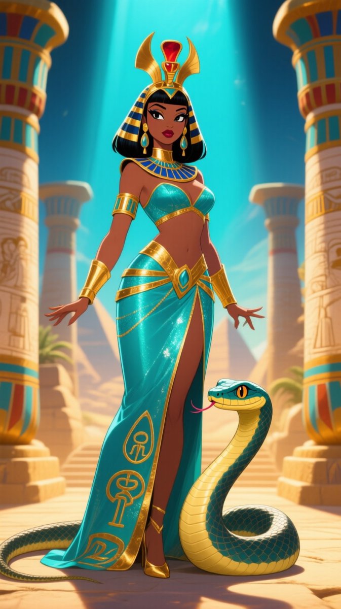 #2 a full-body portrait of cleo de nile in a glamorous outfit, showcasing her signature turquoise and gold color scheme, adorned with jewelry and ancient symbols, standing next to a pet snake, with a backdrop of a mystical ancient egypt, bright lighting, vivid colors, detailed character design, playful expression #Role_MONSTER_HIGH