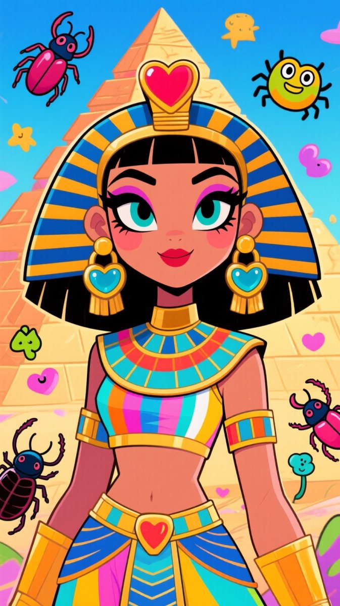 #5 a whimsical and playful depiction of cleo de nile, featuring her with a heart-shaped face and oversized accessories, dressed in a fun, colorful outfit that blends modern fashion with ancient egyptian elements, surrounded by playful cartoonish elements like scarabs and pyramids, bright and cheerful colors, digital art style #Role_MONSTER_HIGH