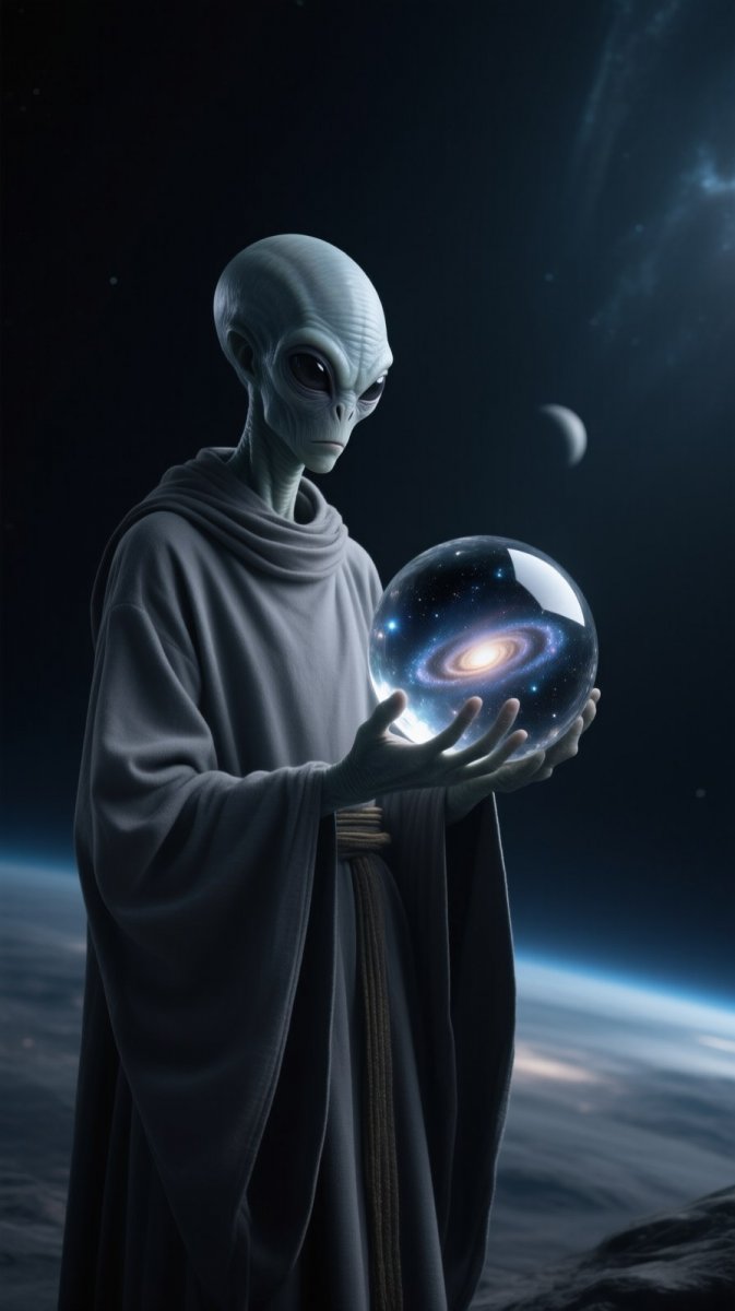 #3. a gray alien wearing a robe, holding a crystal ball with galaxies inside, standing next to a UFO against a dark, mysterious background, HR photography #role_space