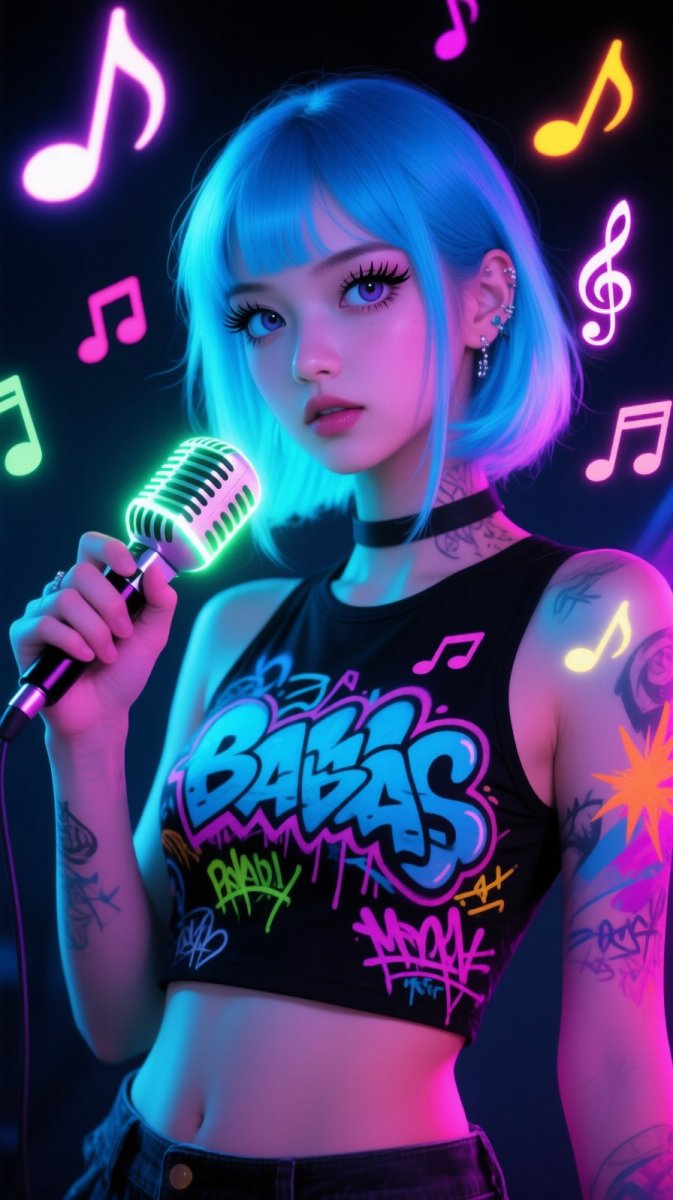 #2. Double exposure of a girl with luminescent blue hair, wearing a black crop top adorned with graffiti patterns, holding a glowing neon microphone, surrounded by floating musical notes and bright bursts of color, set against a dark, moody backdrop. Her eyes are large and expressive, with long lashes, and the composition radiates a sense of rhythm and vibrancy, blending elements of surrealism and pop culture. #Role_BAD_GILL
