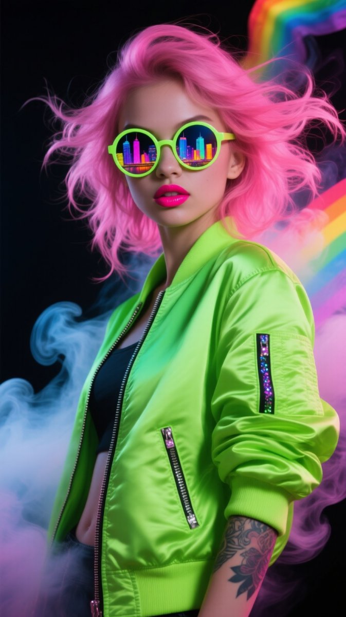 Яркий портрет девушки в неоново-зеленой куртке-бомбере с буйными розовыми волосами, развевающимися хаотичными волнами, огромными круглыми солнцезащитными очками, отражающими красочный городской пейзаж. Вокруг нее клубы радужного дыма, драматичные тени и глубокий черный фон создают атмосферу загадочности и динамизма. Выражение лица – дерзкое и уверенное, подчеркнутое смелым неоновым блеском для губ и сверкающим татуировкой на руке. Эта работа передает сущность городского мистицизма и энергии, воплощая собой бунтарский дух современной эпохи. Кажется, будто перед нами олицетворение свободы самовыражения и непокорности условностям. Это не просто портрет – это визуальный манифест сильной личности, живущей в ритме мегаполиса. Изображение наполнено контрастами: яркость неоновых оттенков сочетается с глубиной черного фона, а хаотичность прически и дыма уравновешивается четкостью выражения лица. Такой образ запоминается надолго, вызывая ассоциации с энергией улиц и бунтарским настроением молодежи. Вся композиция создает ощущение динамики и движения, словно девушка только что вырвалась из толпы, оставляя за собой шлейф радужного дыма. Это визуальный гимн индивидуальности и смелости быть собой в быстро меняющемся мире