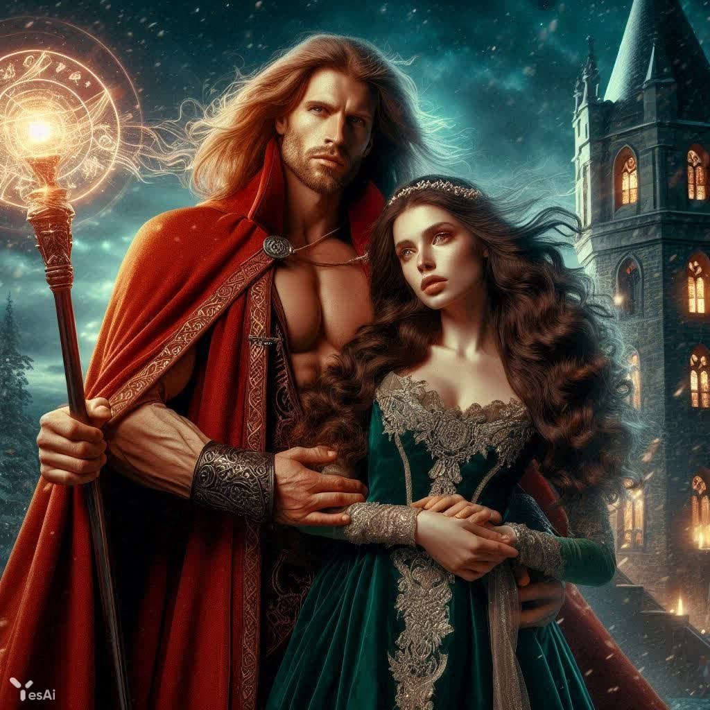 Fantasy. A man 28-35 years old with long golden hair, a muscular mage in a crimson mantle with gold runes, holding a glowing staff, tenderly embraces a beautiful curvy woman 24-29 years old with long dark-brown curls, dressed in an elegant green dress with silver embroidery, suited for a well-off lady. Her gaze is full of admiration, his protective, both looking at the viewer. Background: an ancient tower of a magic academy under a snowstorm, magical light swirls around, night, stars piercing through clouds, magical glow, vibrant colors with crimson, green, and silver accents, epic and romantic atmosphere, hyperrealism, full-length, 1:2