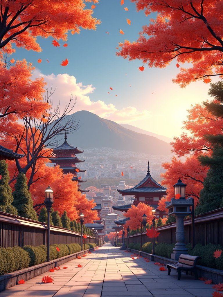 Осенняя панорама восточного города, запечатлевшая умиротворенную красоту природы и архитектуры. Яркие краски заката окрашивают небо в градиент оранжевого и голубого цветов, отражаясь в спокойной глади источника, напоминающего онсэн. Золотые кленовые и гингко листья кружат в воздухе, устилая дорожки парка и создавая живописный ковер под ногами. Вдали виднеются горы, утопающие в осенней листве, а на переднем плане – традиционные восточноазиатские строения: пагоды, храмы и обычные дома, гармонично сочетающиеся с окружающей средой. На одной из улочек города установлена каменная лампадь, освещающая путь сквозь падающие листья. Недалеко расположена скамейка, приглашающая отдохнуть и насладиться моментом. Сквозь ветви деревьев проглядывает голубое небо с редкими облаками, а на одной из веток можно заметить человека, держащего в руках опавший лист. Забор из сетки-рабицы делит пространство парка, добавляя композиции элемент городской среды. На заднем плане виднеется одинокое дерево без листьев, контрастирующее с буйством красок вокруг. В воздухе чувствуется прохлада осеннего дня, а вдалеке мерцают отблески костра, создавая атмосферу уюта и тепла. Эта сцена – воплощение гармонии между человеком и природой, отражающая неповторимую красоту восточного пейзажа в золотой осени. На фотографии запечатлен настоящий момент из реального мира, без присутствия людей, позволяющий зрителю полностью погрузиться в атмосферу спокойствия и созерцания