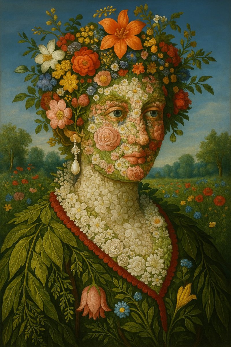 sora Диана весной: аллегория в стиле Арчимбольдо – ожившая красота природы и королевской элегантности. Картинка из нейронной сети Sora Image