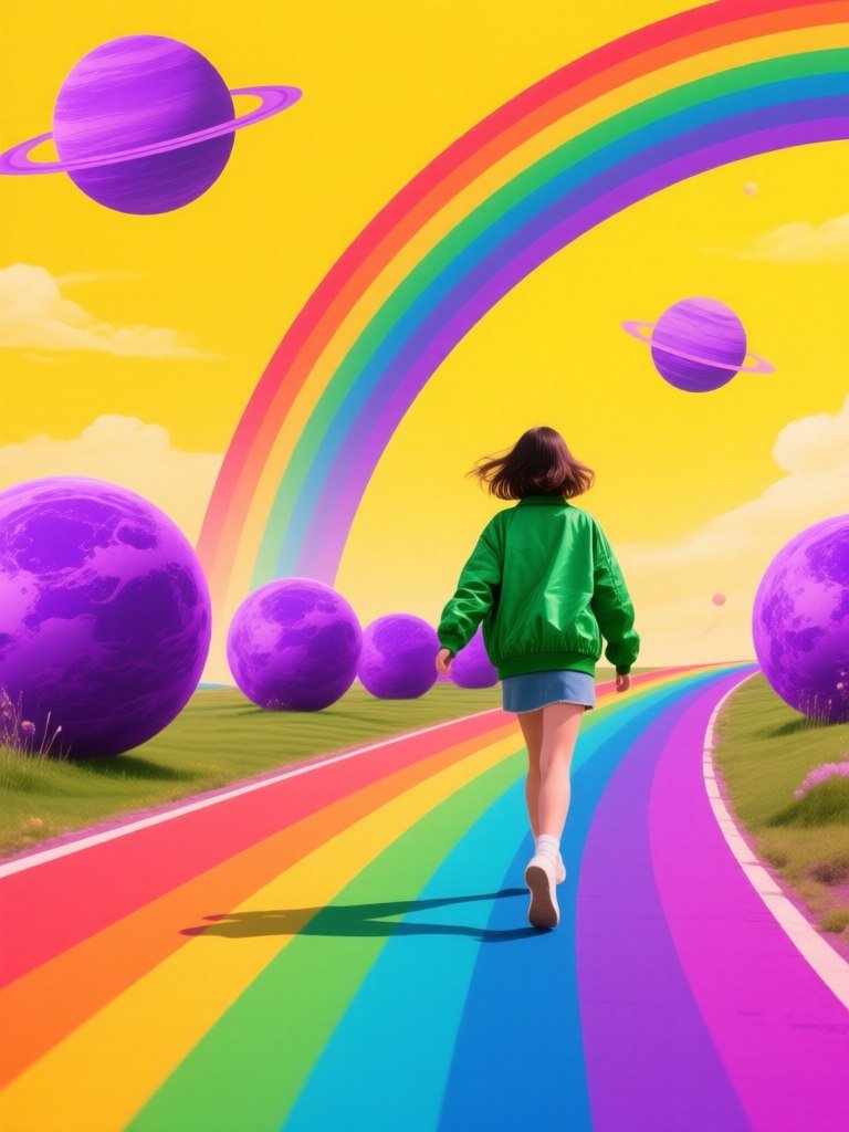 #3 vintage collage showcasing a fantasy scene of a girl in a green jacket walking on a vibrant rainbow road lined with purple planets and a yellow sky, infused with retro and psychedelic styles #role_rainbow