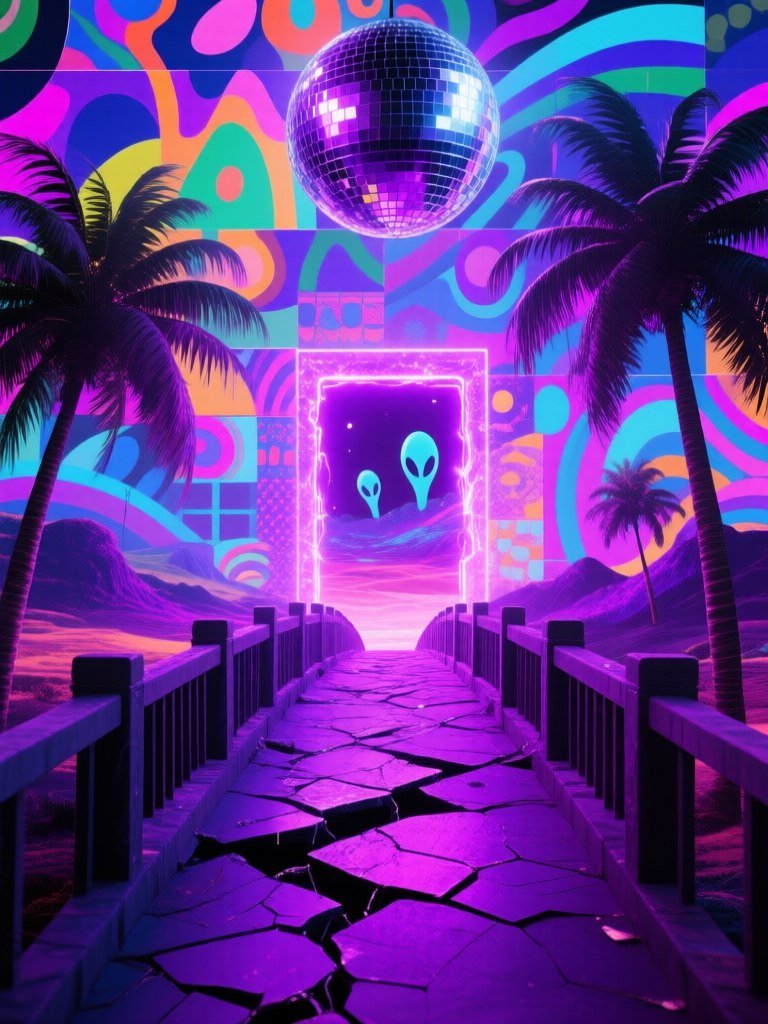 #3 a digital art masterpiece featuring a collage of colorful abstract patterns, a broken bridge leading to a glowing portal, palm trees, and a giant disco ball reflecting a vibrant alien landscape bathed in purple neon light.