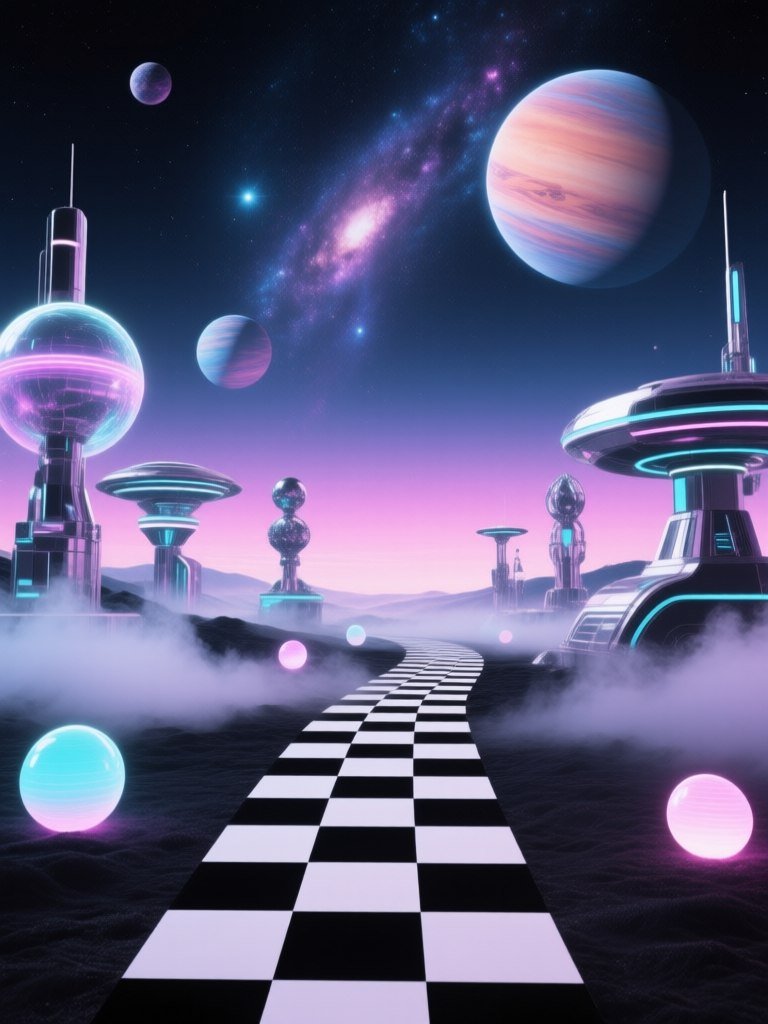 #4 a vaporwave-inspired cosmic scene with futuristic sculptures and glowing orbs, black and white checkered pathways, a smoky atmosphere, and large floating planets against a surreal galaxy sky, showcasing a mix of retro and modern aesthetics.