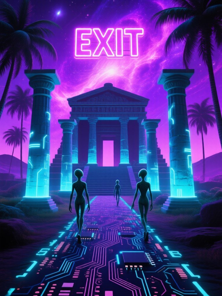 Завораживающий цифровой пейзаж, переносящий зрителя в мир, где древность и футуризм сливаются воедино. В центре композиции возвышается величественный храм, пропитанный духом тысячелетий, его колонны излучают мягкое, пульсирующее свечение, словно живые организмы. Экзотическая растительность – стройные пальмы, тянущиеся к небу – создает контраст с высокотехнологичной атмосферой, царящей вокруг. Небо над храмом окрашено в глубокие оттенки фиолетового и пурпурного, формируя завораживающую туманность, напоминающую о далеких галактиках и неизведанных мирах. По извилистой дорожке, вымощенной сложными схемами печатных плат, неторопливо движутся таинственные фигуры – создания внеземного происхождения, чье присутствие добавляет сцене элемент загадочности и интриги. Над всем этим великолепием возвышается огромный неоновый знак с надписью 'EXIT', ярко освещающий пространство своим холодным светом, словно приглашая зрителя покинуть этот сюрреалистический мир или же наоборот, погрузиться в его глубины. Общая атмосфера наполнена мистическим спокойствием и технологической мощью, создавая неповторимый вайб, характерный для эстетики vaporwave – стиля, сочетающего в себе элементы ретро-футуризма, ностальгии по 80-м годам и цифровой культуры. Картина выполнена в ярком, детализированном цифровом стиле, демонстрируя мастерство художника в создании визуально захватывающих и концептуально насыщенных работ. Это произведение искусства – портал в альтернативную реальность, где прошлое и будущее переплетаются воедино, предлагая зрителю уникальный опыт погружения в мир фантазии и технологических чудес