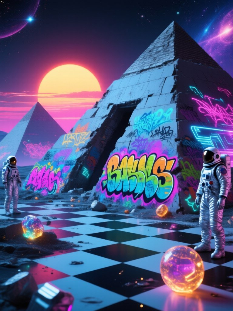 Заброшенные сооружения будущего, напоминающие древние пирамиды, пронизаны буйством красок граффити и цифрового искусства. Небо над ними пылает закатным солнцем, окрашенным неоновым светом, а под ногами простирается фантастический пейзаж в виде шахматной доски. Серебристые скафандры космонавтов словно застыли во времени среди разбросанных светящихся артефактов. Вся сцена наполнена космическими элементами и яркими, насыщенными оттенками, создавая атмосферу таинственности и технологического прогресса, смешанного с упадком и забытьем. Это визуальная поэма о столкновении прошлого и будущего, где древние формы переплетаются с футуристическими технологиями, а красота и разрушение существуют в гармоничном противоречии. Искусство на стенах хранит отголоски давно минувшей цивилизации, рассказывая истории, которые уже невозможно прочесть, но можно лишь почувствовать через визуальный ряд. Кажется, будто здесь время остановилось, оставив после себя лишь следы былой славы и предзнаменование нового начала. Этот мир — памятник угасшей эпохе и одновременно портал в неизведанное будущее, где реальность переплетается с фантазией, а границы между прошлым, настоящим и будущим размываются под влиянием космической энергии и яркого света