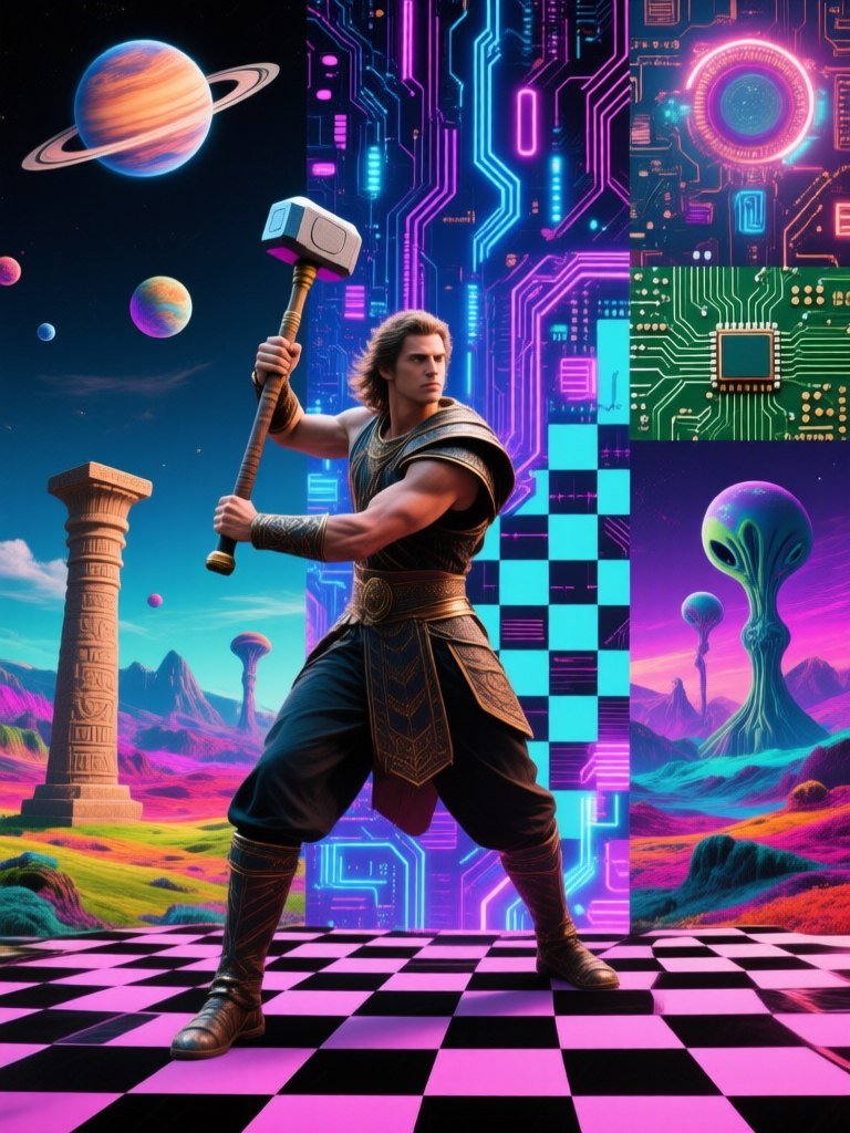 #4 a collage of mythological elements, a figure wielding a hammer surrounded by circuit boards, floating planets, vibrant alien landscapes, with checkerboard patterns and neon lights, a mixture of ancient and futuristic styles, creating a vivid and dynamic composition.