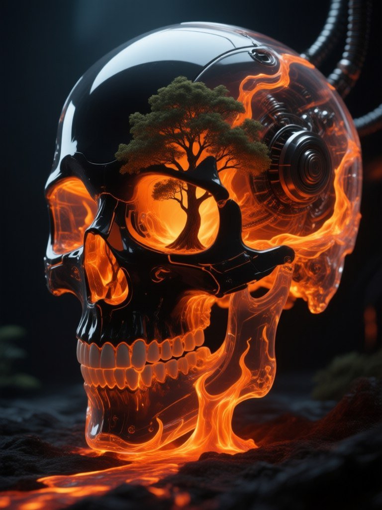 #4 hyper-realistic cyborg skull with flowing lava and a tree inside, transparent features, orange and black color scheme, mystical atmosphere, dark environment, high definition #role_head
