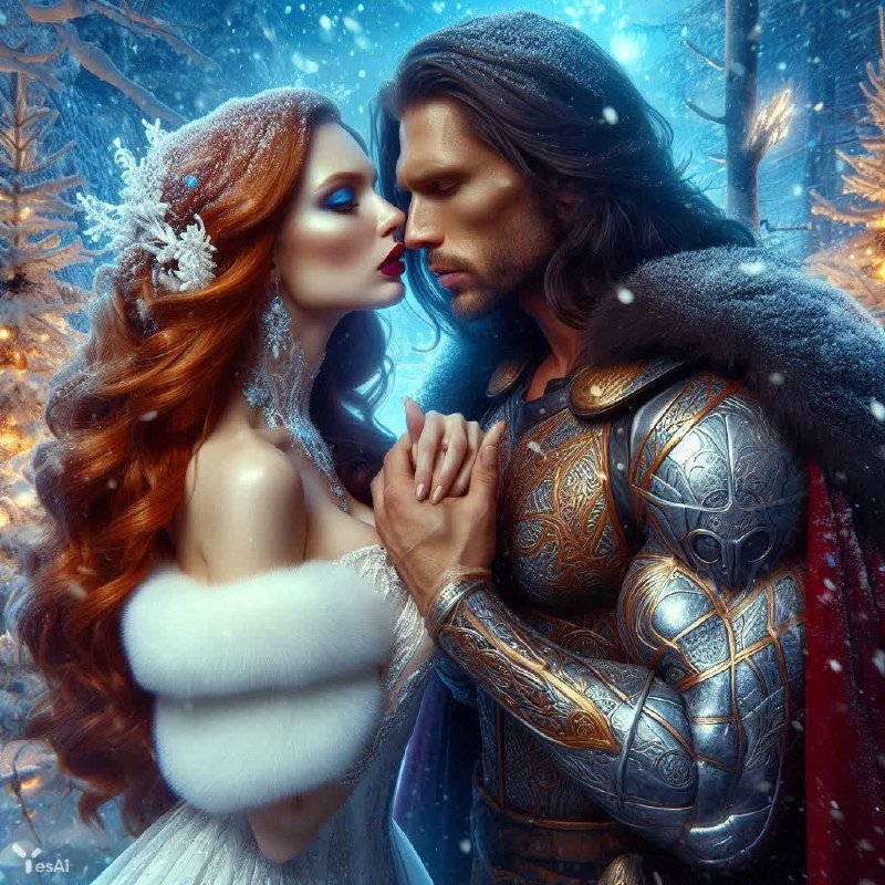 В заснеженном волшебном лесу разворачивается трогательная сцена любви и нежности. Молодая женщина с длинными огненно-рыжими волосами, облаченная в белоснежное зимнее платье с меховой отделкой, страстно целует мужественного мужчину. Его темные волосы ниспадают на плечи, а темный плащ украшен золотыми рунами, намекая на его могущество и принадлежность к таинственному миру магии. Особенностью женщины является ее волшебная ледяная протезная нога – свидетельство пережитых испытаний и силы духа. В их взглядах читается глубокое чувство любви и преданности, направленное прямо на зрителя, вовлекая в интимную атмосферу этого момента. Фон картины представляет собой сказочный зимний пейзаж: искрящиеся снежинки танцуют в воздухе, создавая ощущение волшебства и чуда. Яркие цвета с преобладанием белого и красного придают изображению романтическую теплоту, несмотря на морозную обстановку. Гиперреализм исполнения позволяет рассмотреть каждую деталь – от текстуры меха до блеска золотых рун. Картина выполнена в формате крупного плана 1:1, что усиливает эффект присутствия и эмоциональное воздействие на зрителя, погружая его в мир фантазий и любовных переживаний. Эта работа является воплощением красоты, силы духа и вечной любви в окружении магической зимней сказки