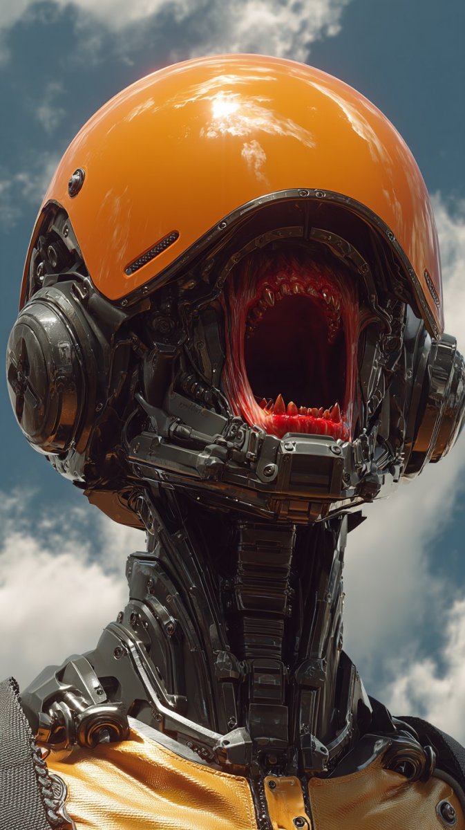 Захватывающее зрелище: трехмерная визуализация устрашающего черного робота, чье открытое горло обнажает ряд зловещих красных клыков. Его взгляд прикован к камере, создавая ощущение непосредственного столкновения с механическим хищником. Робот облачен в яркий неоново-оранжевый шлем, который контрастирует с темной металлической структурой и добавляет футуристический акцент. Изображение выполнено в гиперреалистичном стиле, отличается исключительной детализацией и фотореализмом, что позволяет рассмотреть мельчайшие элементы конструкции робота – от текстуры металла до сложных узоров на шлеме. Влияние стиля Грега Рутковски проявляется в драматическом освещении и общей атмосфере эпичности. Композиция фокусируется на лице и шее робота, подчеркивая его выразительную мимику и угрожающий вид. Гладкие пряди волос, неожиданный элемент для механического существа, добавляют нотку загадочности и словно намекают на некую связь с человеческим началом. Фон представляет собой мягкое облако желтого цвета, создающее ощущение парения в невесомости и усиливающее эффект сюрреализма. Это мощное изображение сочетает в себе элементы научной фантастики, ужасов и искусства, представляя зрителю завораживающий образ технологического кошмара. Контраст между холодным металлом робота и яркими цветами шлема и облаков создает визуальную напряженность и привлекает внимание к ключевым деталям композиции. В целом это впечатляющая работа, демонстрирующая мастерство в области трехмерной графики и художественного видения
