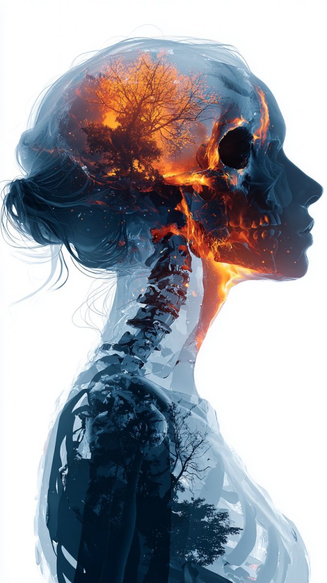 Завораживающее цифровое полотно представляет собой портрет прекрасной женщины, где голова служит окном в удивительный мир. Внутри черепа, словно под стеклянной крышкой, бушуют черные клубы дыма и языки алого пламени, создавая контрастный и захватывающий эффект. Скелет, просвечивающийся неоновым светом, накладывается на изображение, придавая картине футуристический оттенок. Мягкие линии текущей воды добавляют динамики и плавности композиции. Минималистичный дизайн подчеркивает чистоту форм и акцентирует внимание на деталях. На белом фоне выделяется силуэт женщины в профиль, ее гладкая кожа кажется полупрозрачной, а темные волосы обрамляют лицо. Вдали, внутри оранжевой сферы, виднеется камень и дерево – символы жизни и природы, контрастирующие с технологичным образом. Яркие цвета создают ощущение энергии и силы, а стекловидный черепной капюшон добавляет элемент загадочности и сюрреализма. Это не просто портрет, это визуальное исследование красоты, технологий и хрупкости человеческого существования. Картина сочетает в себе элементы научной фантастики, современного искусства и глубокую символическую нагрузку, оставляя зрителя в состоянии задумчивости и восхищения. Изображение пронизано атмосферой тайны и будущего, где переплетаются органическое и искусственное, жизнь и смерть