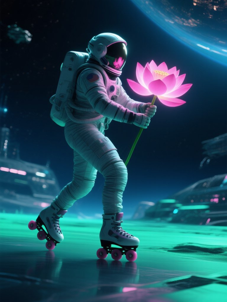 Астронавт на роликах в космосе с цветком лотоса - Результат генерации нейросети Qwen images Ai
