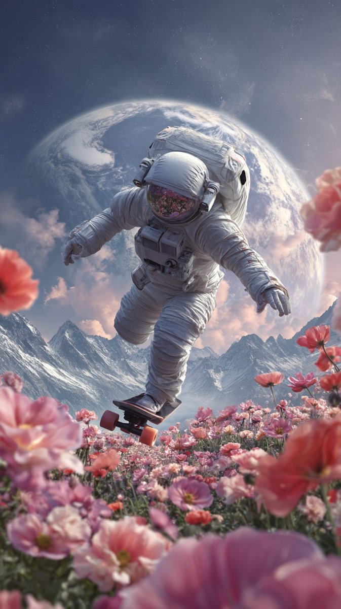 Невероятное сочетание гравитации и безграничной фантазии! Этот захватывающий дух образ демонстрирует астронавта, ловко рассекающегося на роликовых коньках в бескрайнем космическом пространстве. Уникальный момент запечатлел его хватку за лунный пейзаж, создавая ощущение притяжения и невесомости одновременно. На переднем плане расцветают буйство красных и розовых цветов, добавляя яркий акцент в эту сюрреалистическую картину. Вдали величественно возвышаются горы, а над ними, словно символ надежды и дома, восходит прекрасная планета Земля. Вся композиция пронизана кинематографической атмосферой, создающей ощущение полного погружения в эту фантастическую реальность. Высочайшее разрешение HD и технология HDR обеспечивают невероятную детализацию и глубину цветов, делая каждый элемент изображения живым и реалистичным. Это не просто изображение – это визуальное путешествие в мир грез и безграничных возможностей, где даже в космосе можно ощутить радость движения и красоту земных даров. Картина излучает оптимизм и вдохновение, напоминая о том, что нет ничего невозможного, когда речь идет о человеческой фантазии и стремлении к новым горизонтам. Этот шедевр визуального искусства захватывает воображение и заставляет задуматься о месте человека во Вселенной