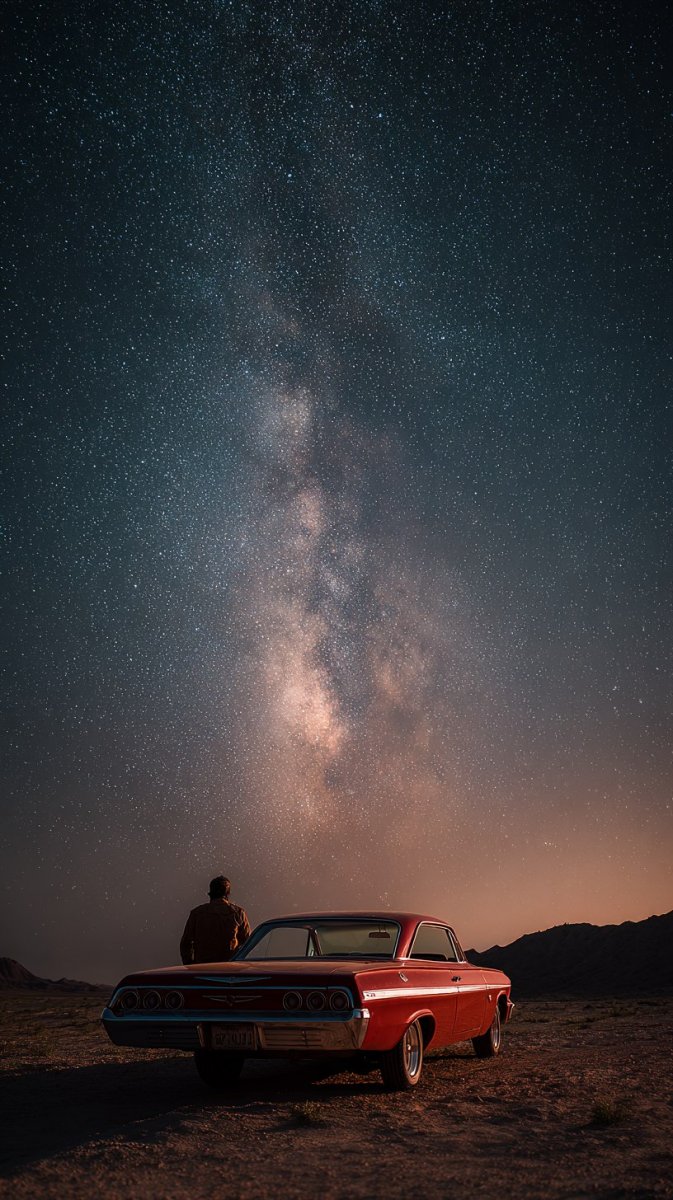 an astronaut building sand castles on mars, an old red chevrolet impala facing away from the camera with the milky way hanging in the night sky, professional photography, dark and mysterious #role_space