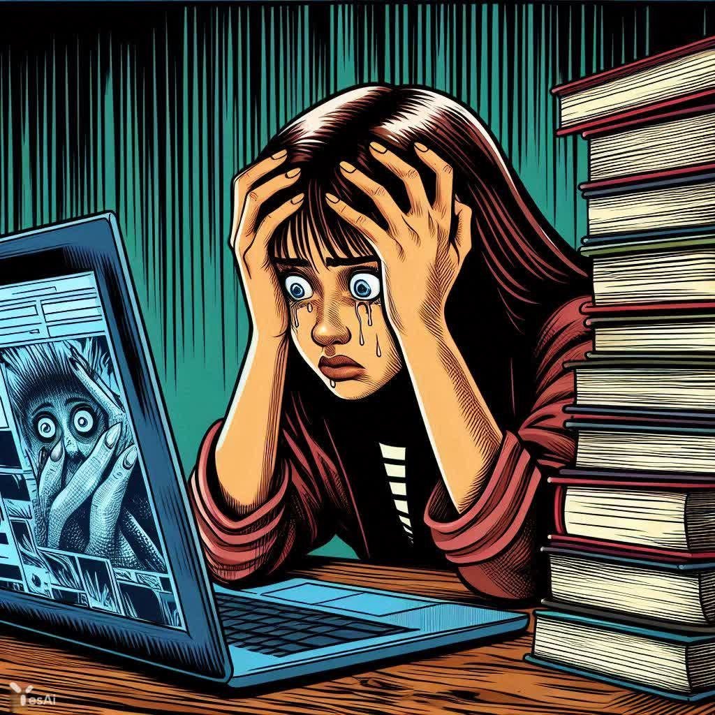 Девушка сидит за столом, прижимает ладони к лицу, в глазах ужас, девушка смотрит на экран открытого ноутбука. Рядом лежат стопки книг.